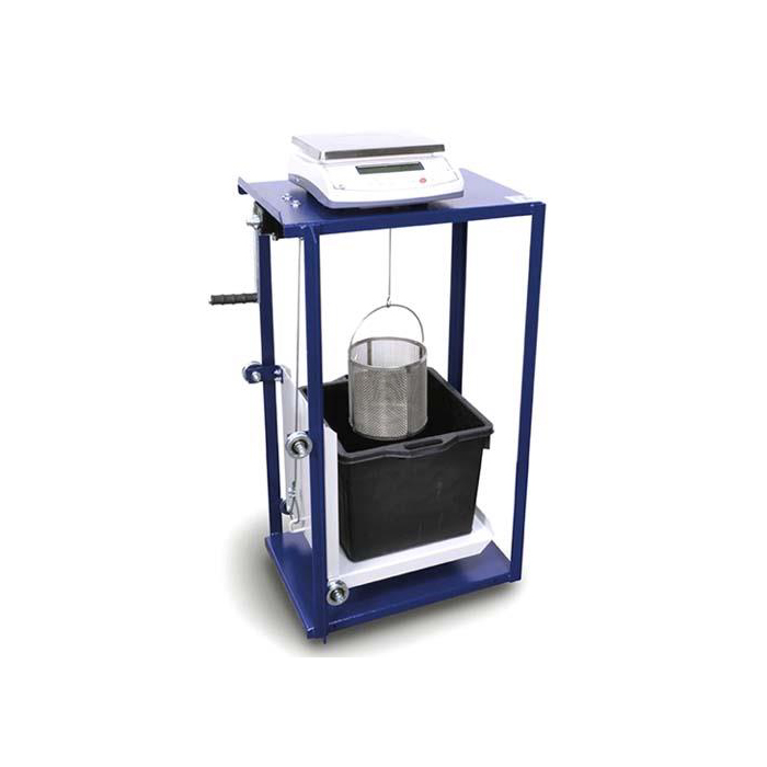 The buoyancy balance system developed by us consists of a rigid support frame. Incorporating a water tank mounted on a platform. A mechanical lifting device is used to raise the water tank through the frame height immersing the specimen suspended below the balance fixed on a cradle.