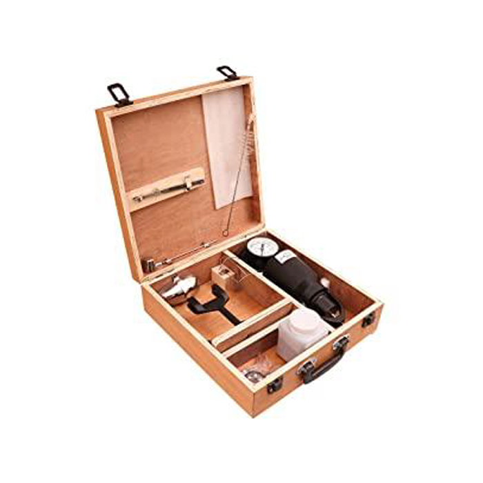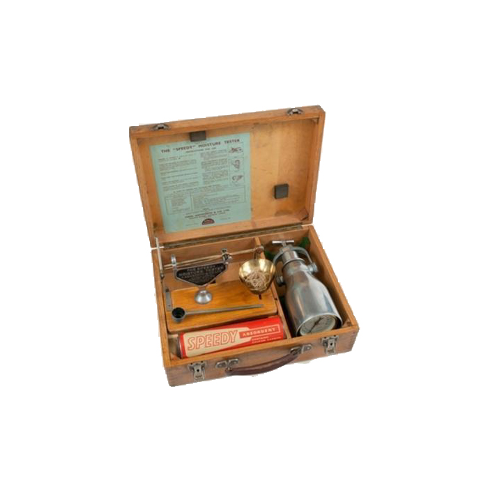 The unit consists of a pressure vessel with clamp for sealing cap, capacity is 6 gms. Rubber sealing gasket, pressure gauge calibrated in percentage moisture content on the wet weight basis, a counter poised balance for weighing sample, a scoop for measuring carbide reagent, a bottle of reagent, one cleaning brush and a set of 4 steel balls for thorough mixing . Complete in highly polished wooden carrying case with handle.